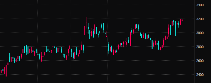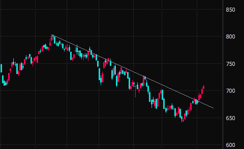下のチャートはグロース250指数のものですが、下降トレンドをブレイクアウトしているようにも見えます。